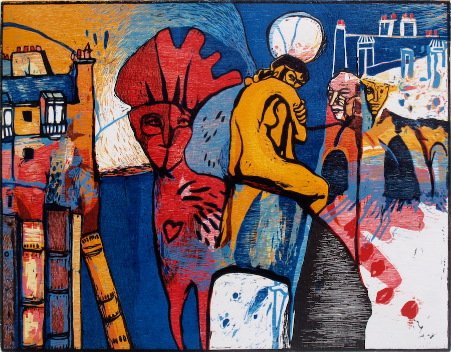 En faisant défiler les gravures sur bois de Raūl, on constate une évolution intéressante au fur et à mesure de la douzaine d’années de création représentée dans l’exposition. Les gravures en noir et blanc – pour l’instant plus nombreuses que les gravures en couleurs – ont évolué vers un style personnel où l’imbrication des lignes et des formes contribue à créer un univers onirique et poétique intemporel. En parallèle, les gravures en couleurs, nécessitant l’emploi d’une dizaine de matrices, tout en alliant contours noirs et plages colorées, suivent une évolution différente : la diversité des couleurs et leurs contrastes s’imposent à l’oeil au détriment du dévelopement de la ligne (« La lune », « Danse la nuit » 2022). Cette tendance un peu plus statique des compositions en couleurs se transforme cependant peu à peu. Le lien entre contours noirs ou en couleurs et plages colorées tend vers une harmonie plus dynamique, comme dans « Le tissu des rêves » de 2024. Raūl Villullas tient à continuer à graver des images en noir et blanc et en couleurs, il dit avoir « besoin de trouver des équilibres et entrelacer des projets en noir et des projets en couleurs ».
